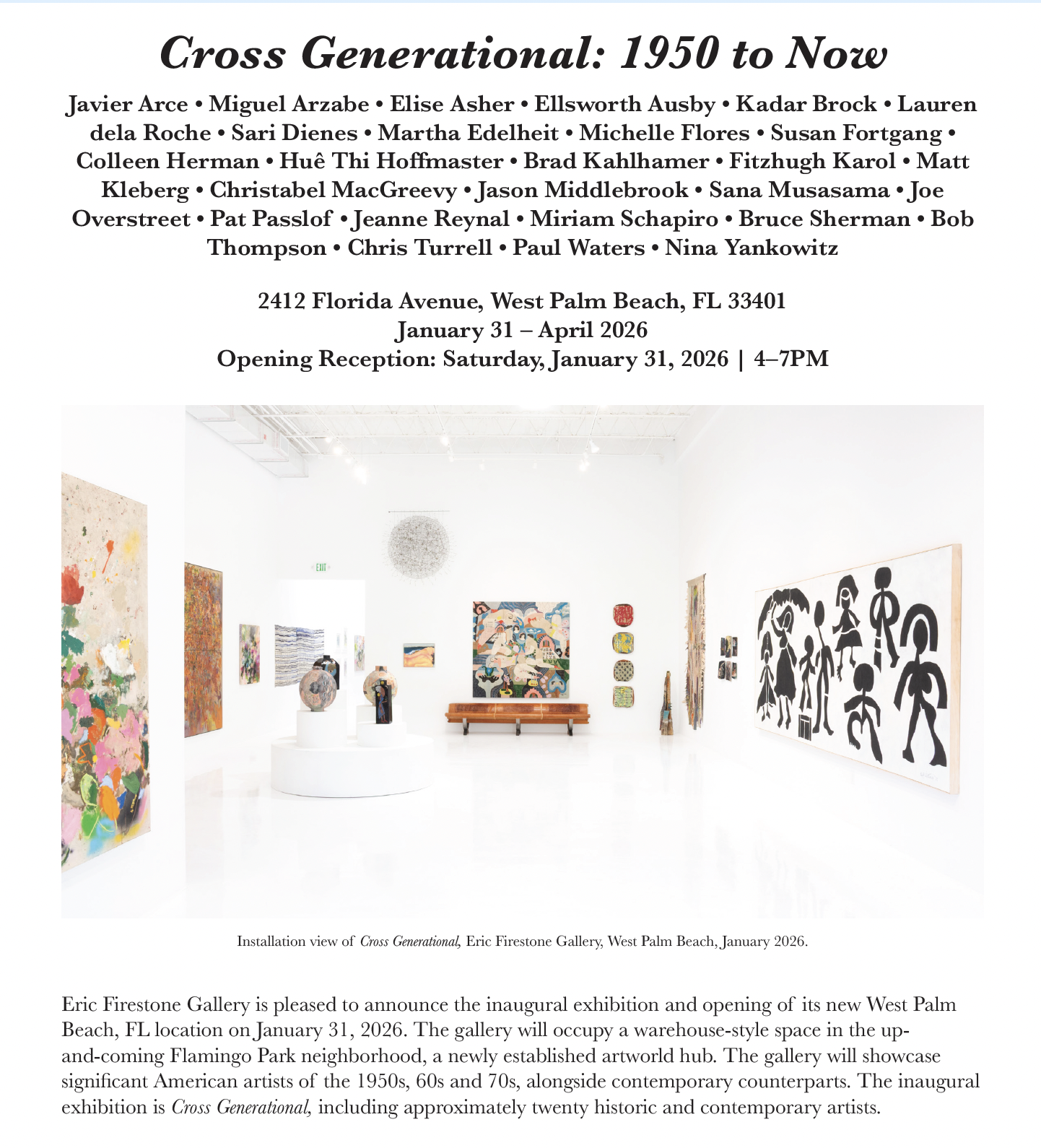 Eric Firestone Gallery is pleased to announce the inaugural exhibition and opening of its new West Palm Beach, FL location on January 31, 2026. The gallery will occupy a warehouse-style space in the up-and-coming Flamingo Park neighborhood, a newly established artworld hub. The gallery will showcase significant American artists of the 1950s, 60s and 70s, alongside contemporary counterparts. The inaugural exhibition is Cross Generational, including approximately twenty historic and contemporary artists.