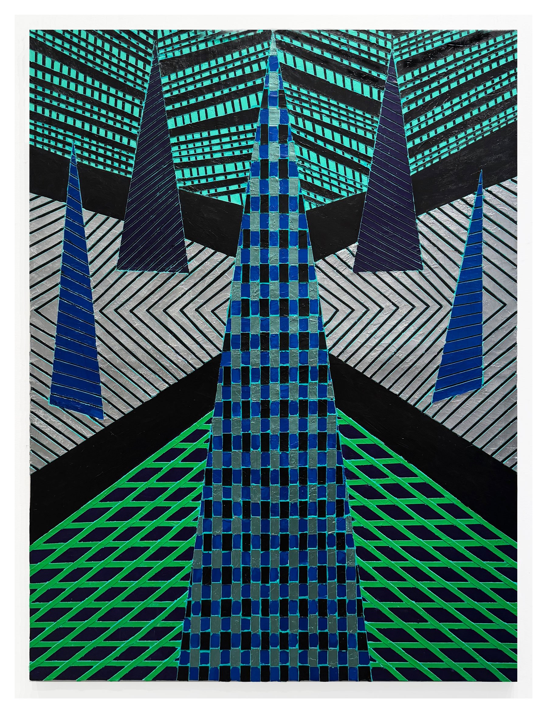 Many paintings from this period have central diamonds surrounded by a patterned environment. The directionality of the area around the diamonds contrasts with the center image. I have used this format in paintings both large and small. These paintings incorporate both metallic and opaque acrylic paint. The Chevrons are part of a series of works in a long thin format. Again, a large shape fills the canvas moving in one direction while surrounding patterns creates opposition and movement beyond the edge.